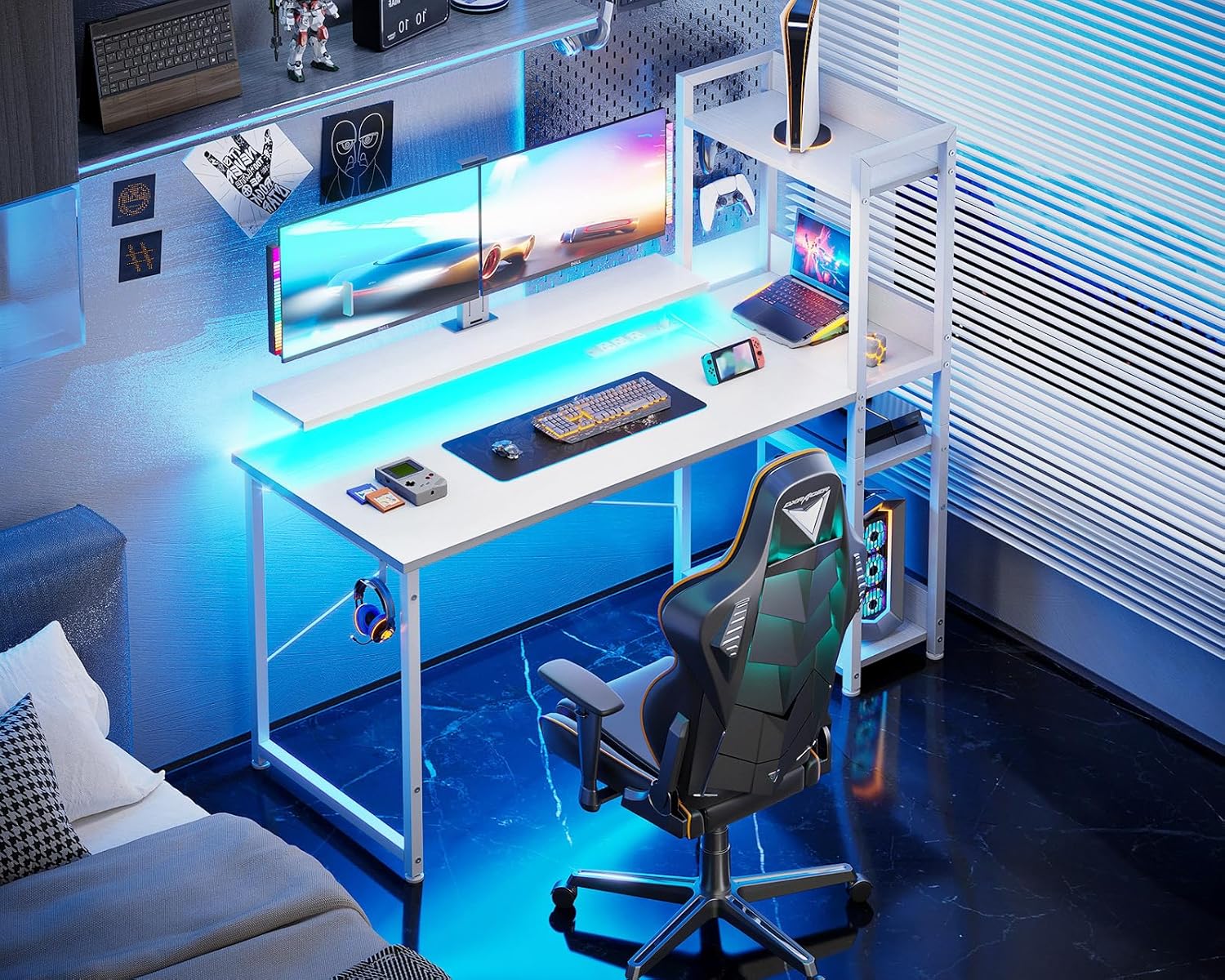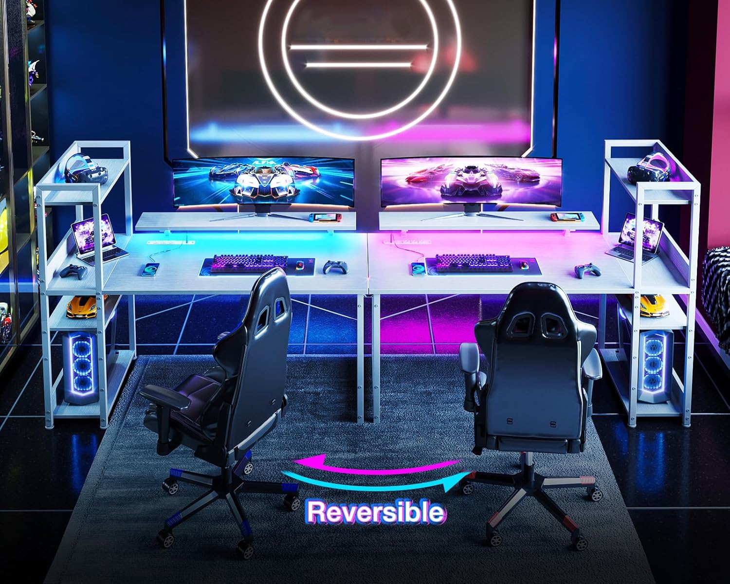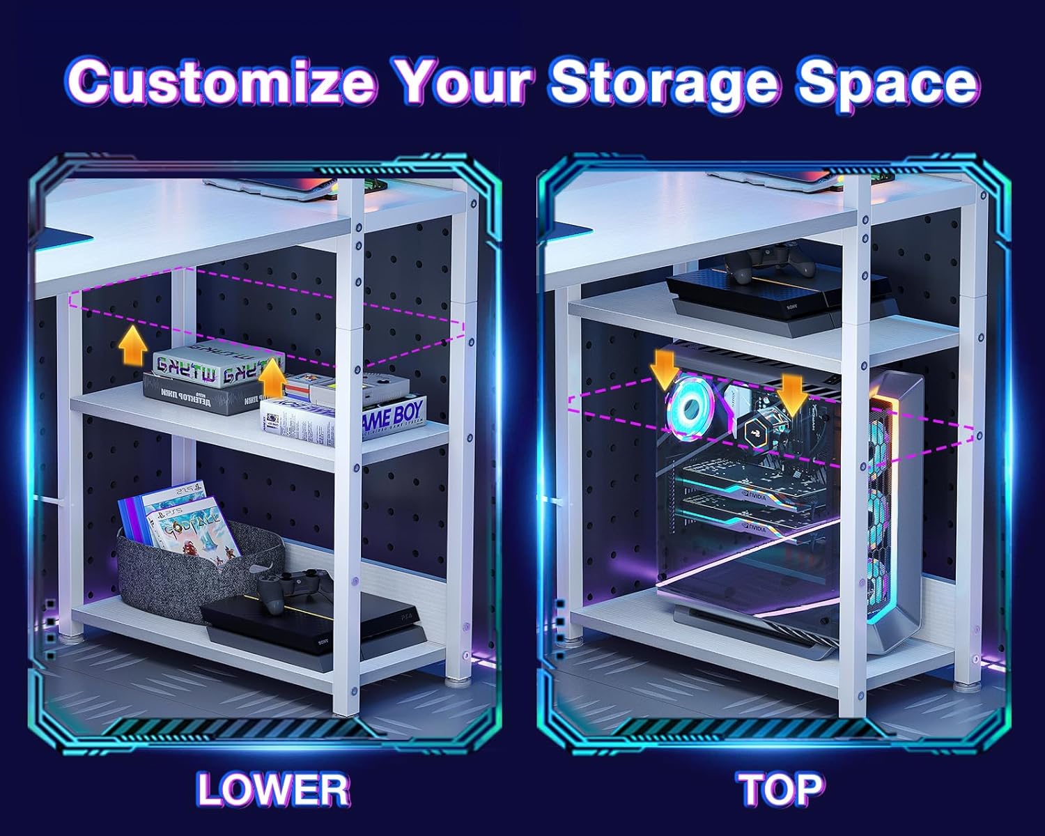 - ?Gaming Desk with Colorful LED Lights?This gaming table features LED strip that contains 10 static colors, 6 brightness grades, 10 dynamic modes and memory function with switching controls. Adjusting to the proper lighting can reduce eye strain, improve focus, and create a comfortable workspace/gaming space.