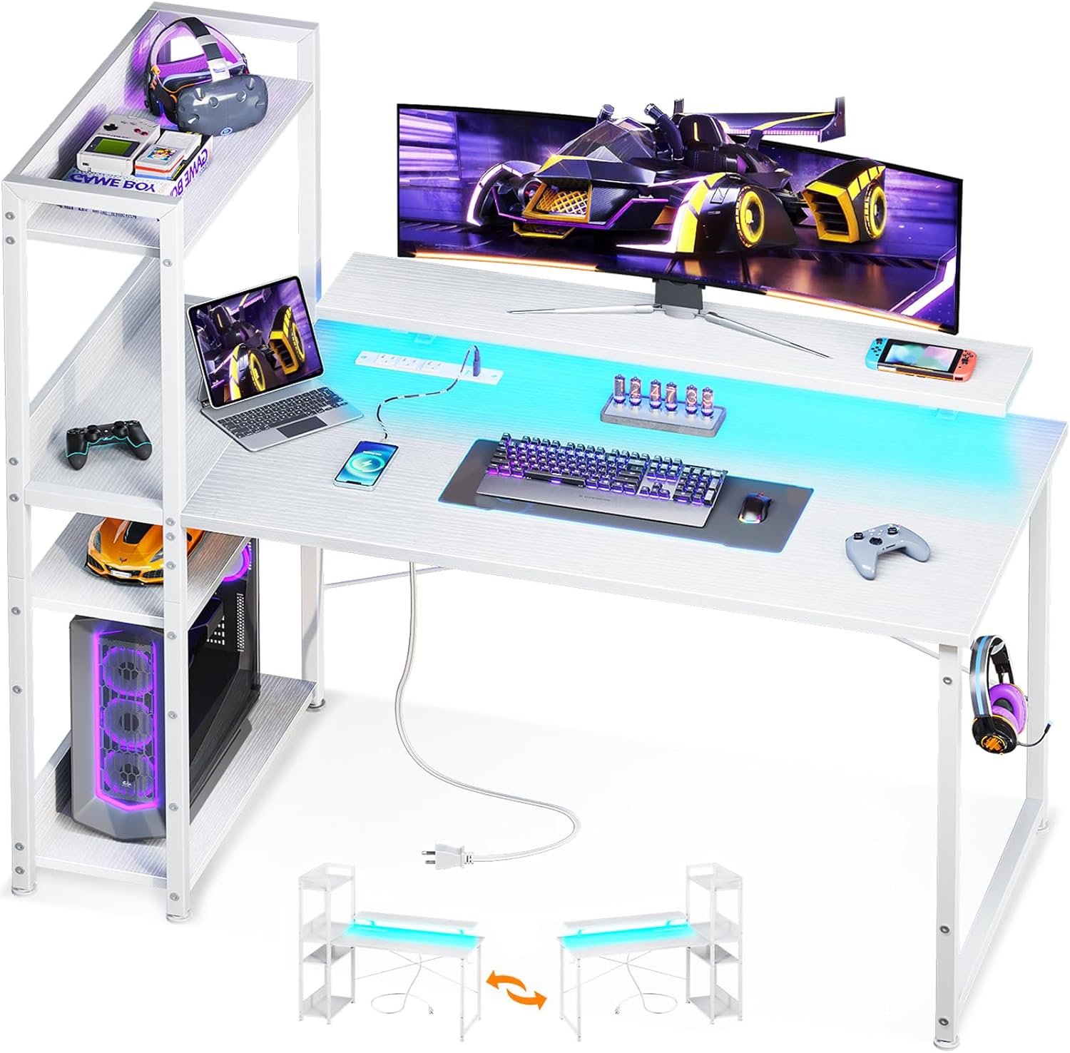 ODK Computer Desk with USB Charging Port & Power Outlet, 48 Inch Writing Desk with Storage Shelves and Monitor Stand, Reversible Study Table for Home Office, Small Space Bedroom, White