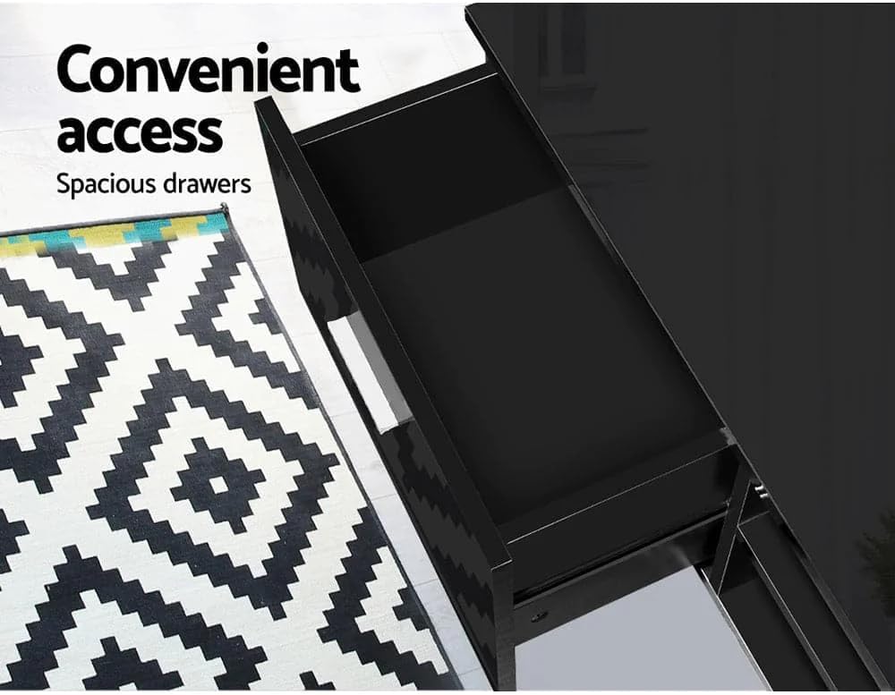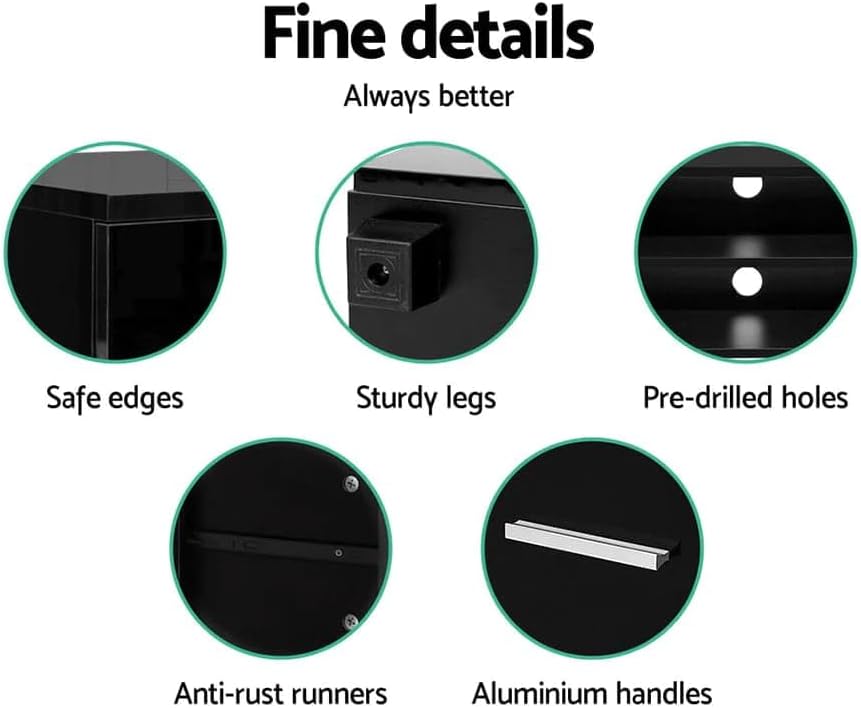 - ALUMINIUM HANDLES: The drawers feature aluminium handles that add a stylish accent to its black hues.