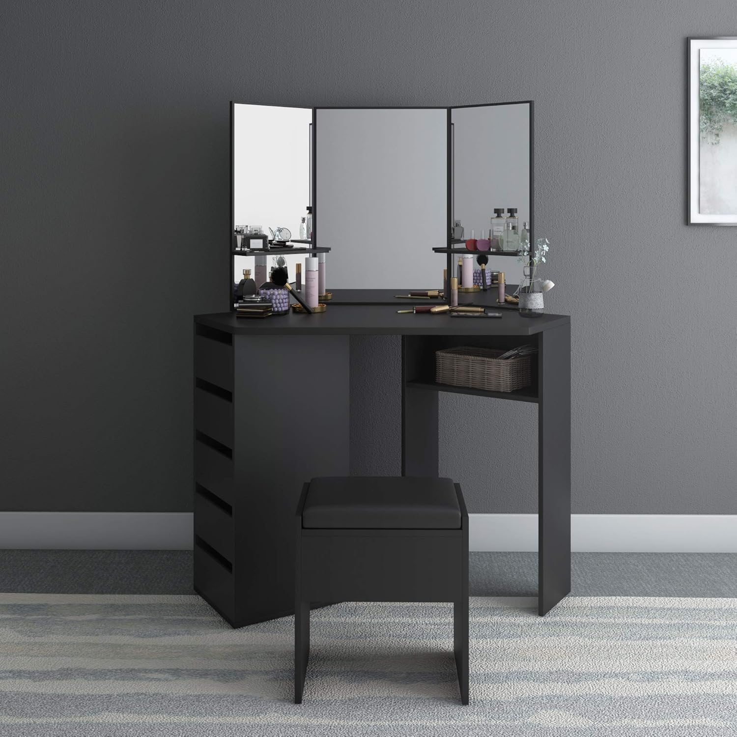 Panana Corner Dressing Table Set, Makeup Dresser Table with 3 Large Mirrors, 5 Drawers and Stool Vanity Console Bedroom Modern Furniture (Black)