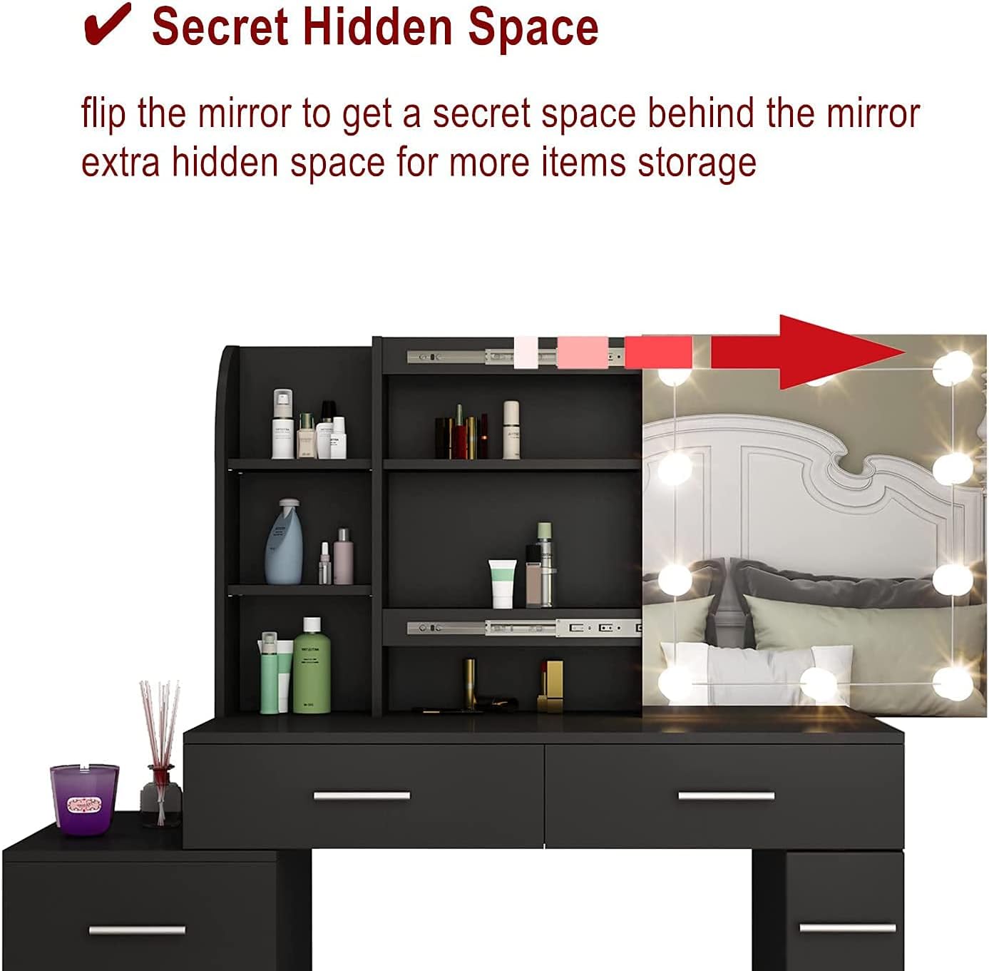 - ??SUPER LARGE VANITY STORAGE SPACE?PARADISE FOR COSMATIC LOVERS?? Containing 5 drawers, 1 pull out closet and 6 open shelves and a hidden space in the sliding mirror, all your cosmetic and makeup tools such as eye shadows, perfumes, brushes or jewelries have their places on this dressing table and will be easy to reach out. Keep all your beauty supplies organized and say goodbye to messy storage.