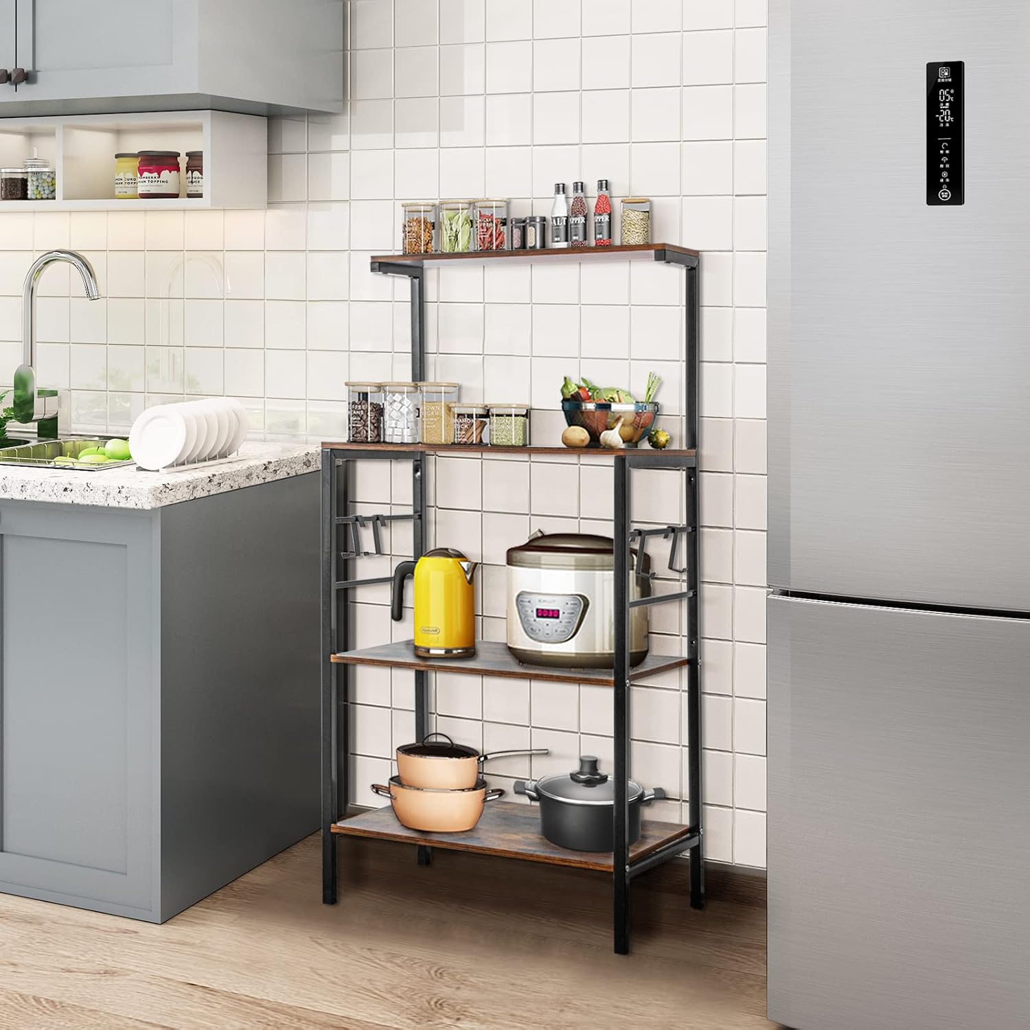 Sasoiky Bakers Rack for Kitchen,4-Tier Kitchen Storage Shelf Rack,Microwave Cart Coffee Bar Microwave Stand Rack with 4 Hooks,Bakers Racks for Kitchens with Storage(Rustic Brown)