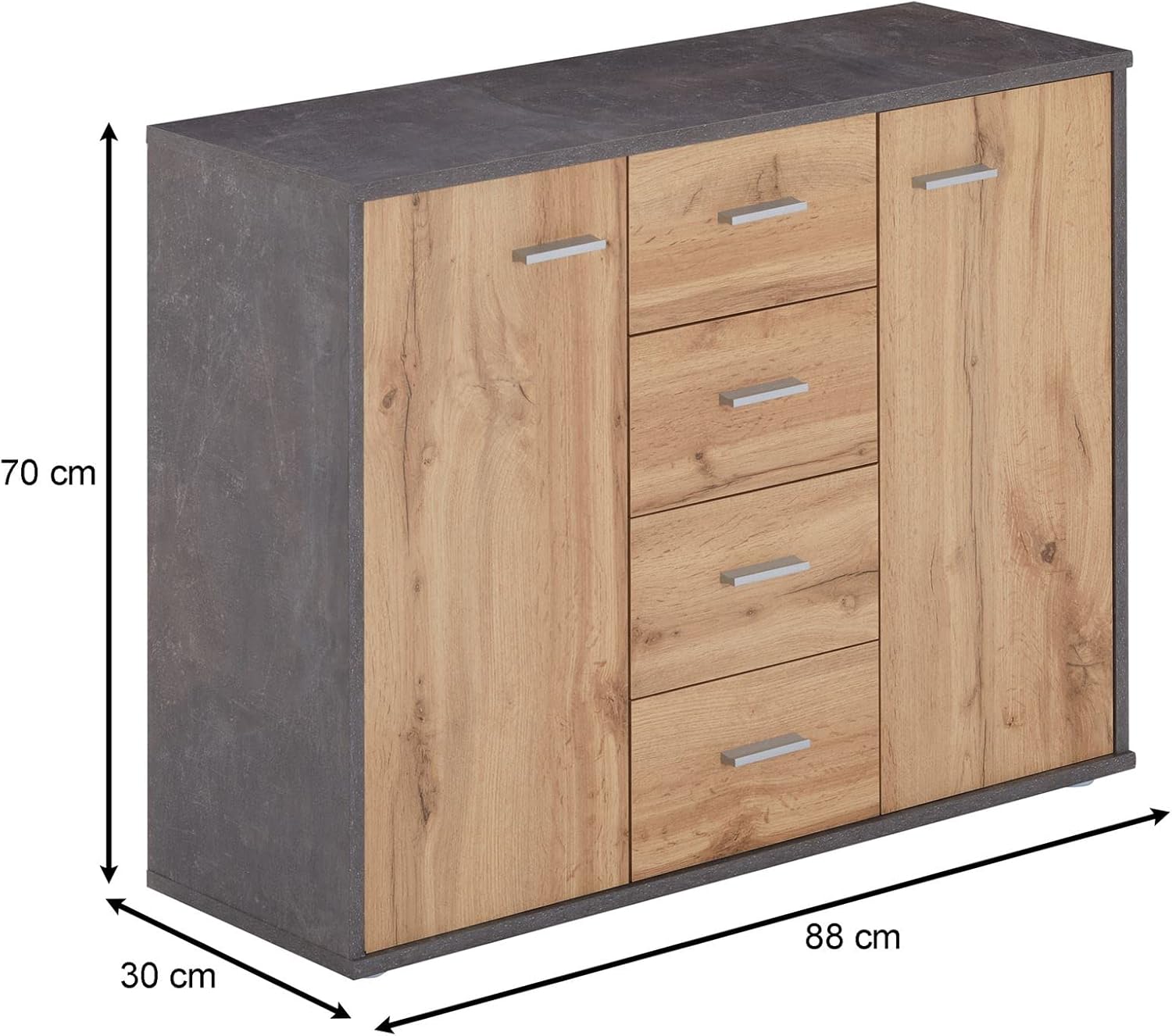 CARO-Möbel Jamie Sideboard with 2 Doors and 4 Drawers, Modern Chest of Drawers Office Furniture in Concrete Dark / Wotan Oak