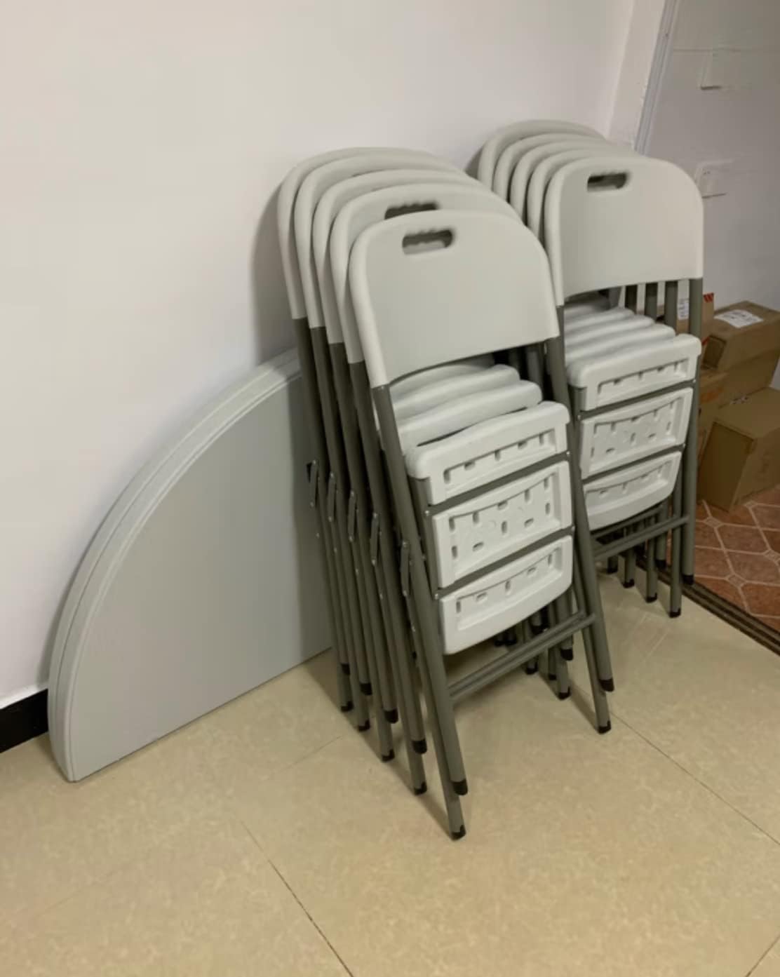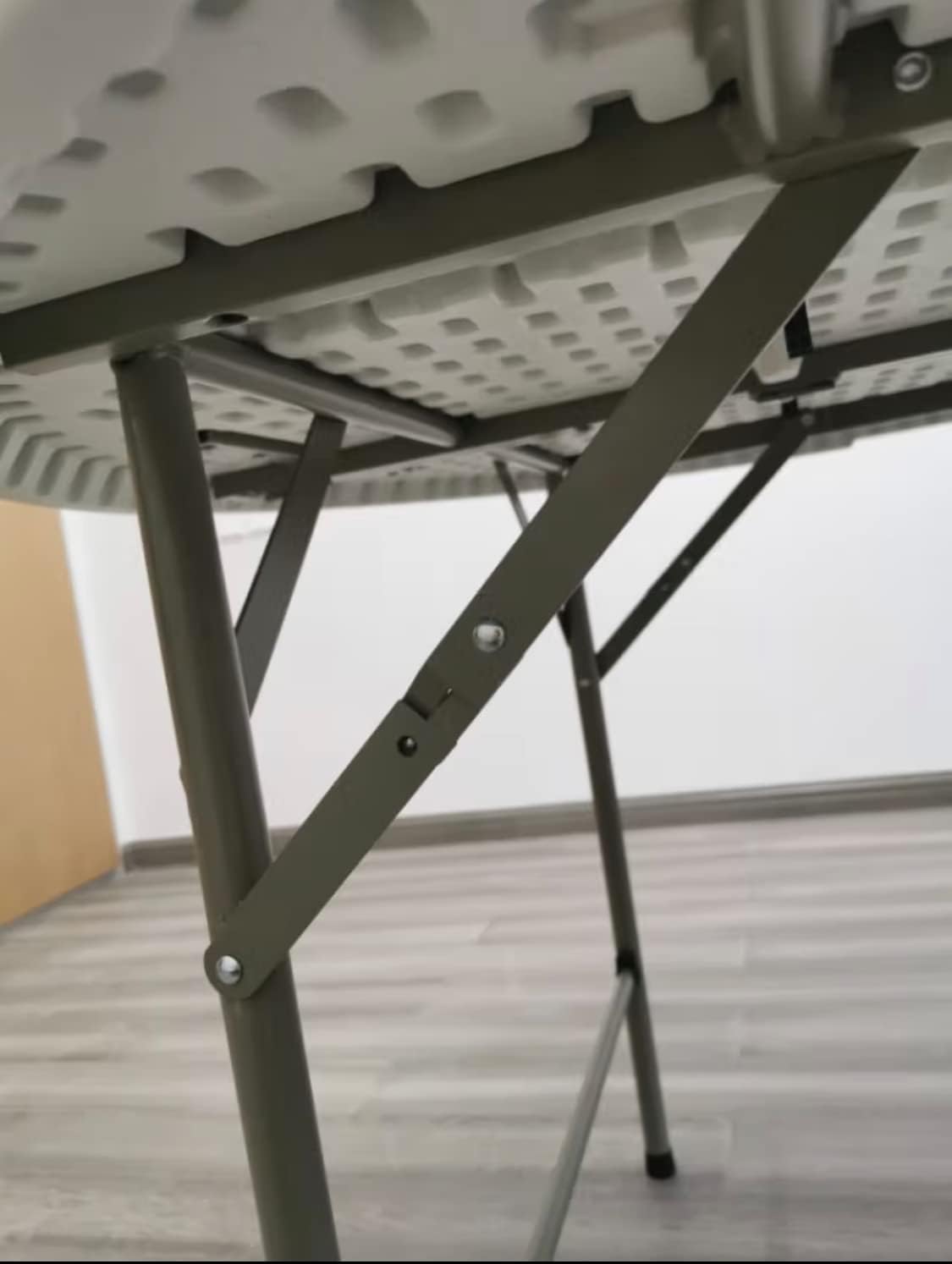- ???Portable and Space-saving?Hosting just got much easier with this ready to use bi-fold 48‘’ round plastic folding table Attached carrying handle makes it easy to transport while the legs fold under for storage