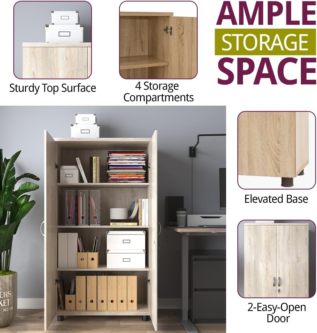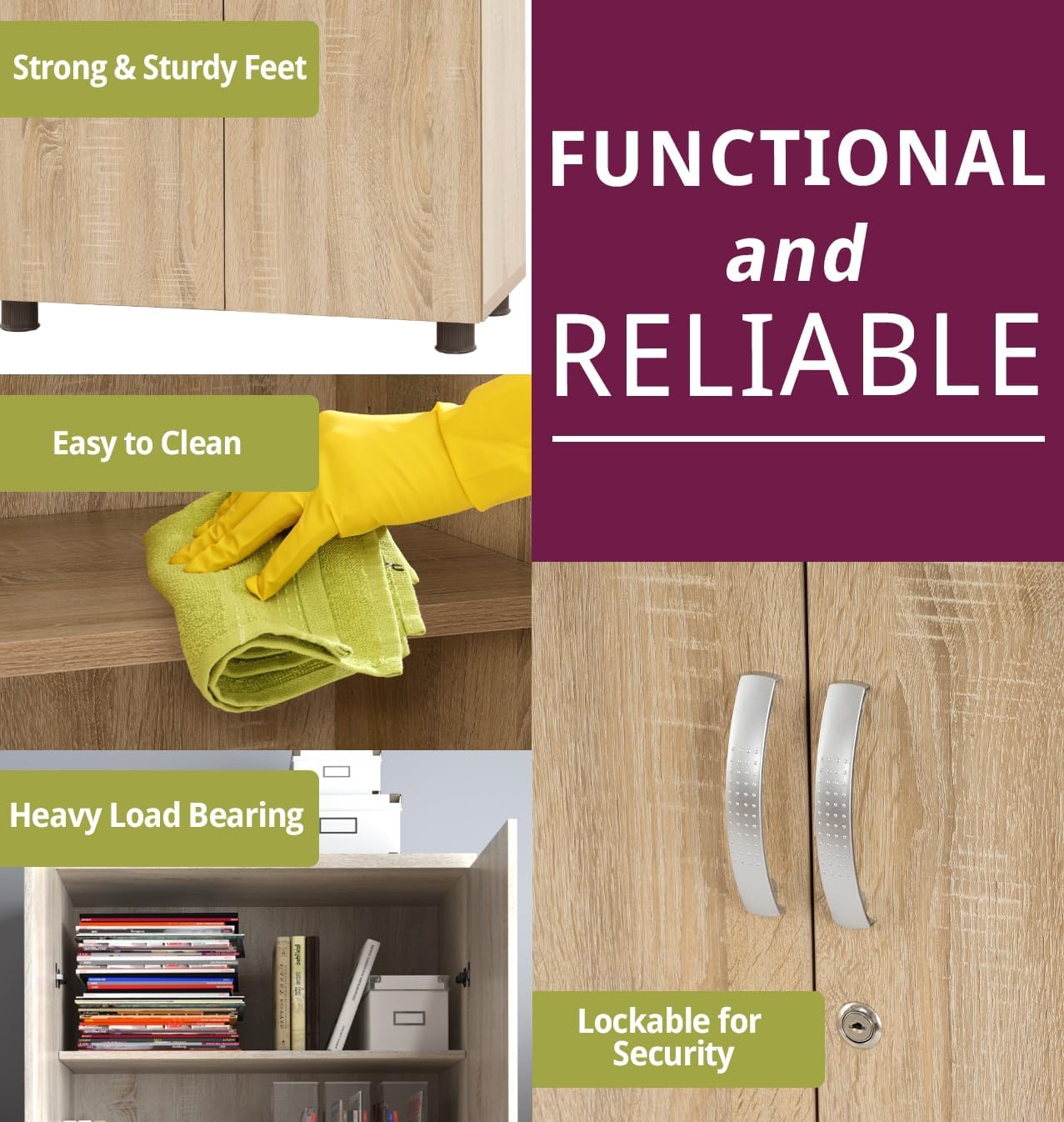 • AMPLE STORAGE | Cupboard features 4 internal shelf with 2 lockable doors. This piece is perfect for storing books, games, linen, CDs, DVDs, files, folders, and displaying photo frames on top shelf. It will keep your belongings stored