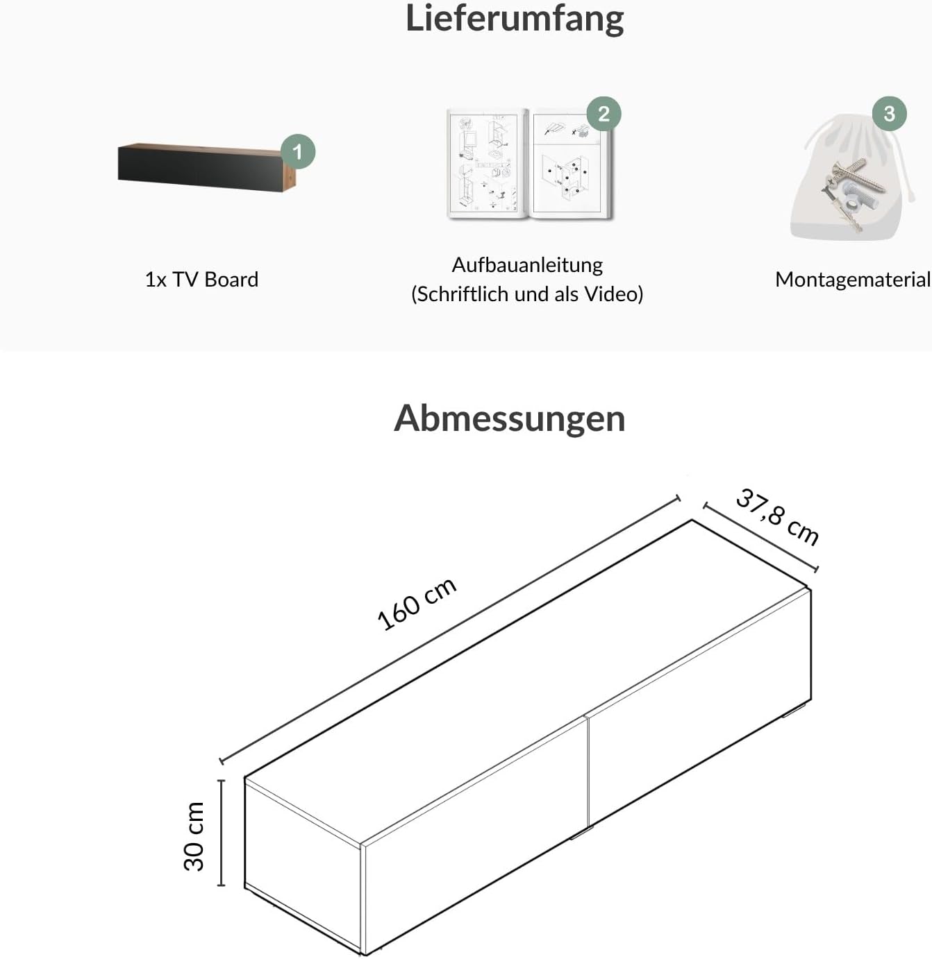 - Box contents: 1 x TV board 160 cm, including mounting material, assembly instructions and furniture feet for easy wall or stand mounting as desired.