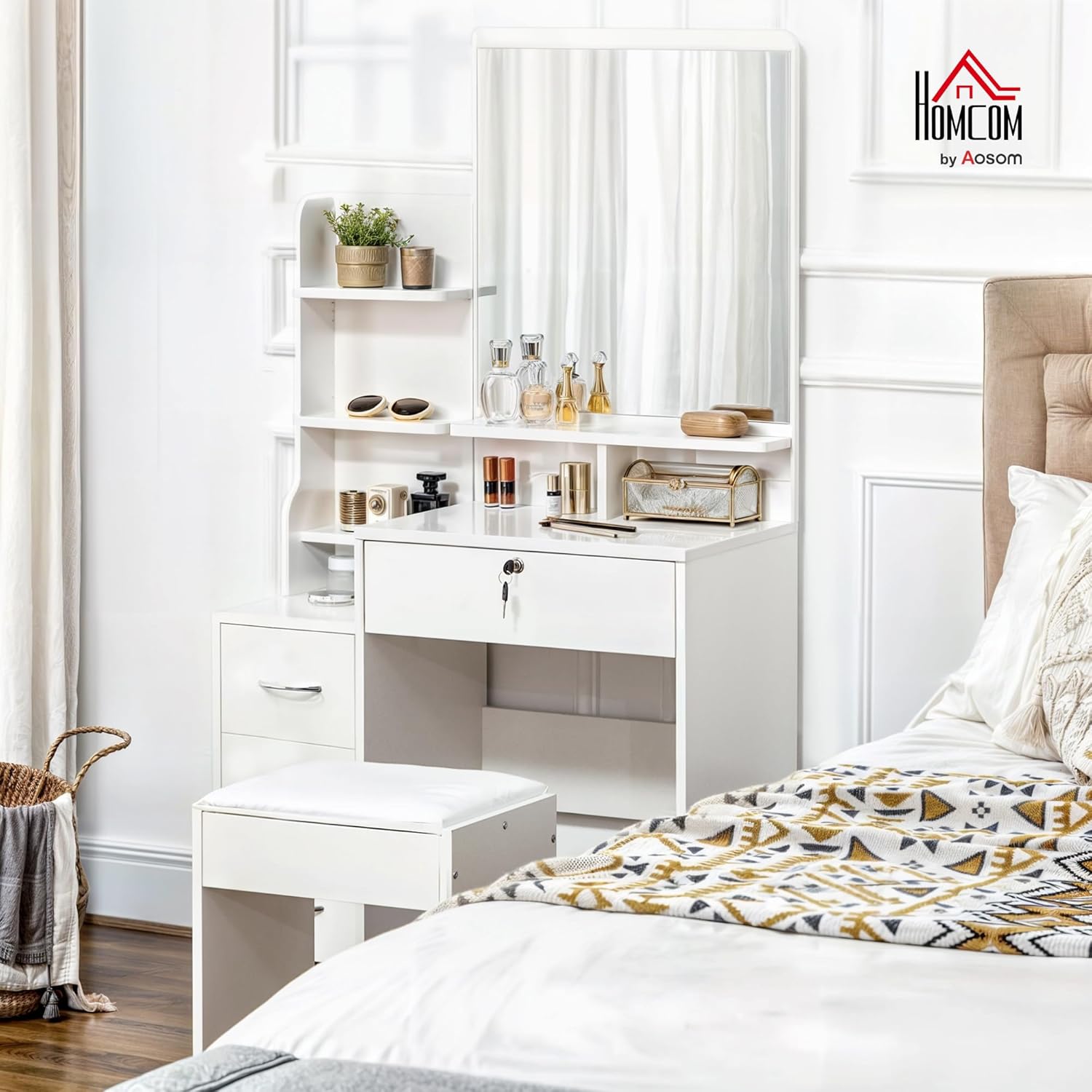 HOMCOM Makeup Vanity with Stool and Mirror Makeup Table with 4 Drawers 4 Storage Compartments Modern Style 80 x 38 x 143 cm White