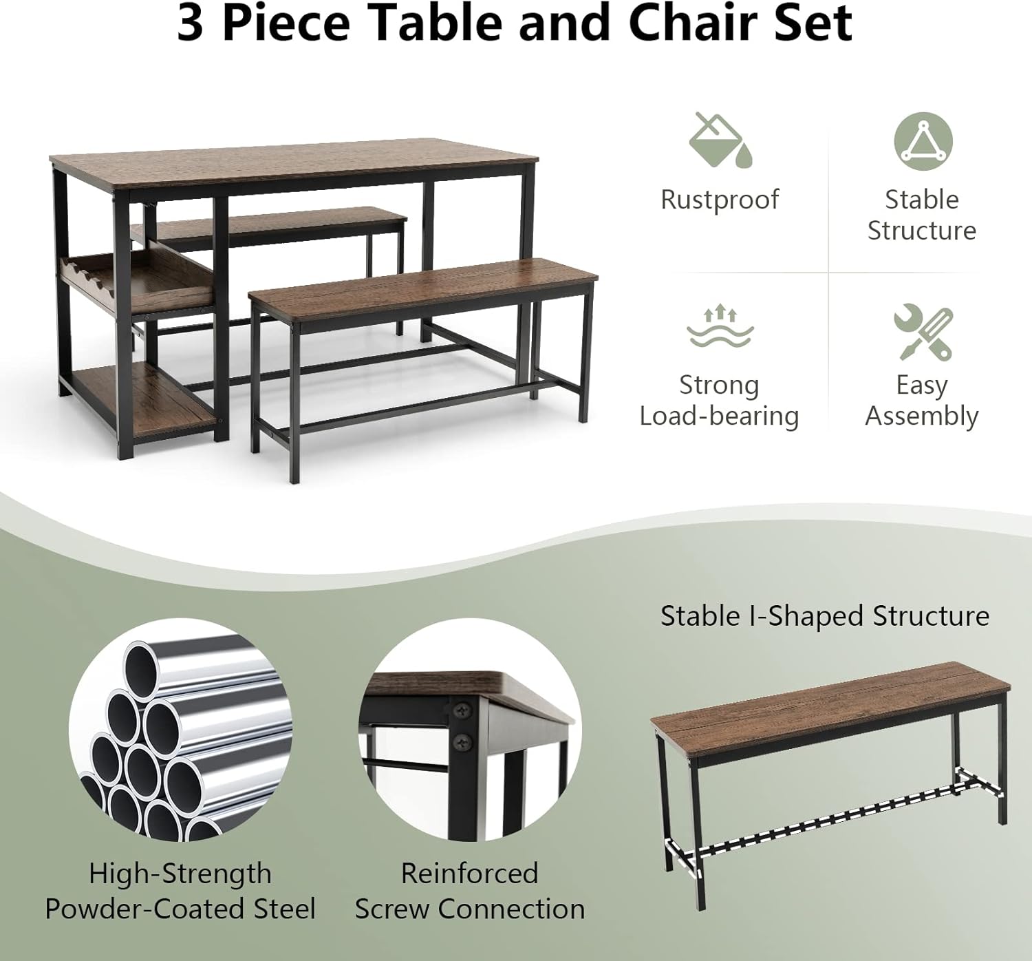 TANGZON Dining Table and 2 Bench Set, 3 Pieces Kitchen Dining Table Set with Wine Rack, Glass Holder & Storage Shelf, Space-Saving Breakfast Dining Furniture for Home Living Room Restaurant (Wooden)