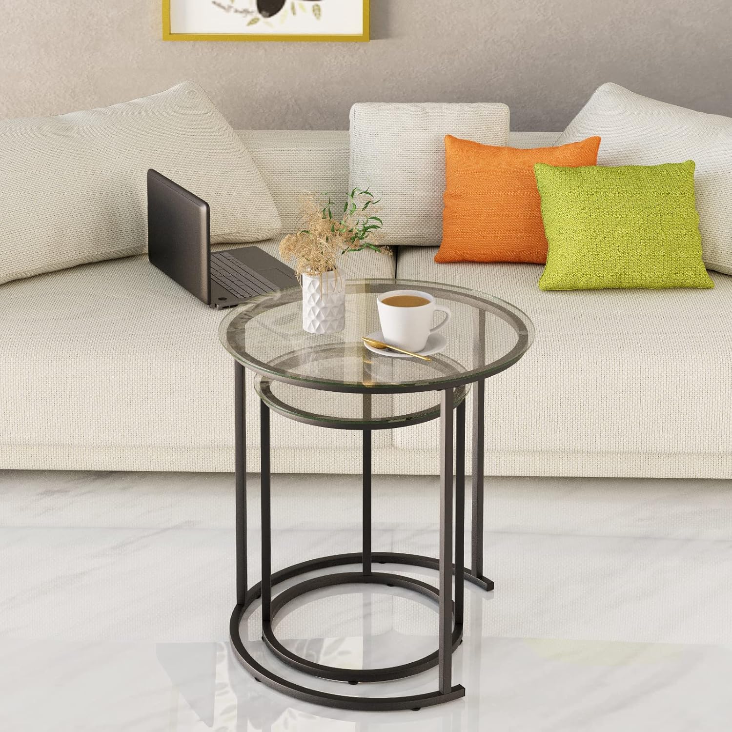 - ?SIMPLE & ELEGANCE?This set of side table is made of high quality tempered glass,which is hard in material and has good heat resistance. The table legs have a multi-layer spray painting process, with uniform color and smooth touch, and the paint surface is not easy to fall off.