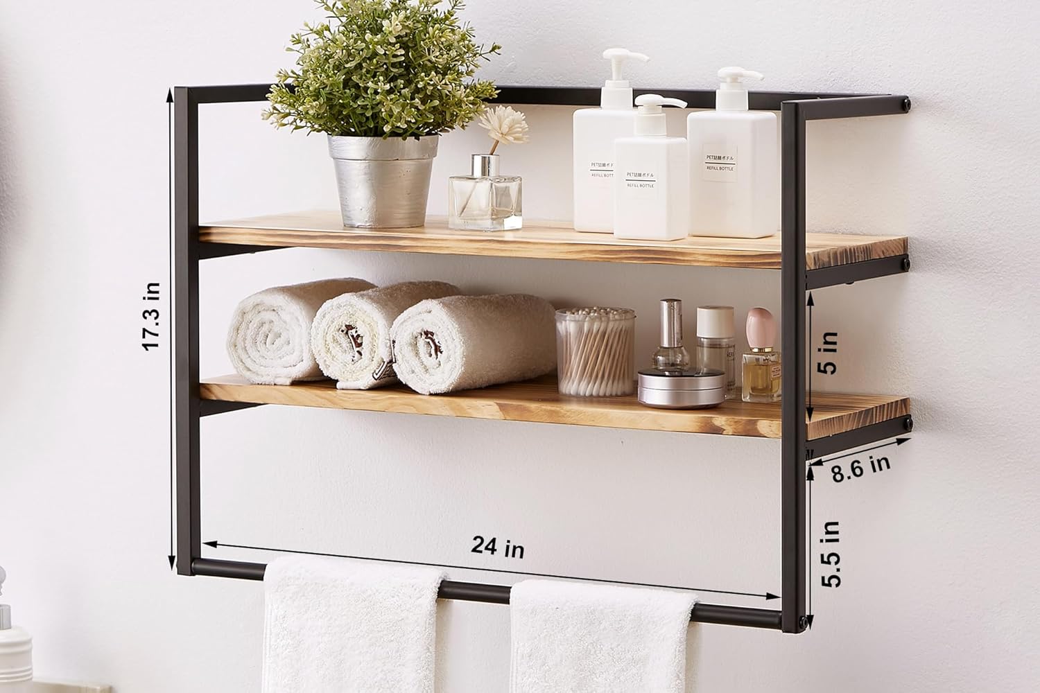 - Floating Shelves with Towel Bar - With multiple tiers of shelving,This wall shelf is a unique and practical storage solution for bathrooms. Unlike traditional towel racks,You can also use it to display decorative items, books, plants, and other essentials, and the sturdy brackets allow for easy mounting to maximize your space.