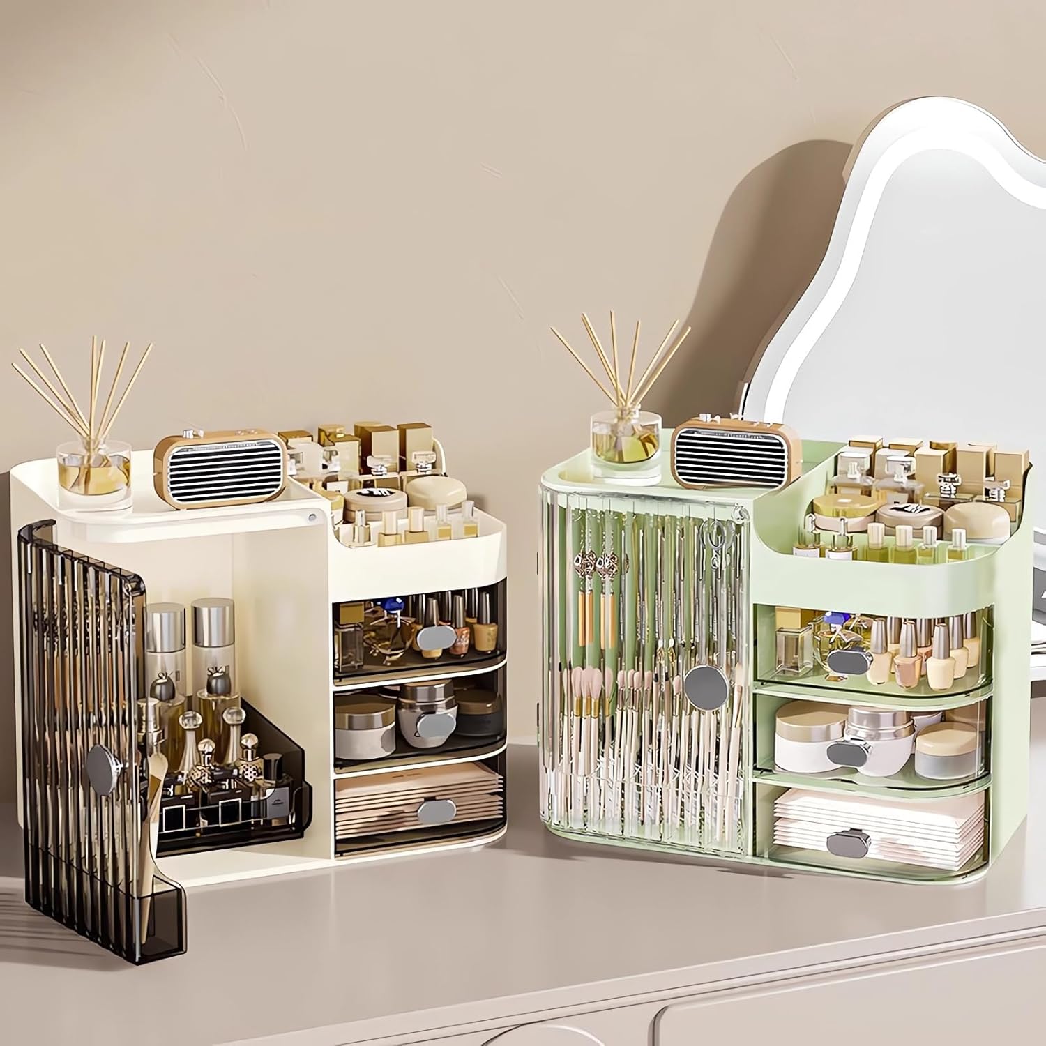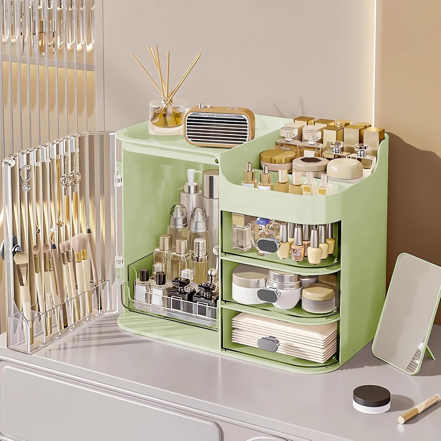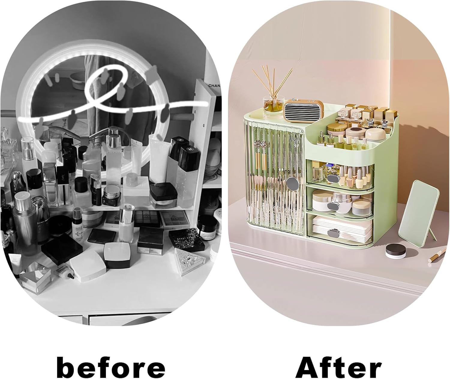 DASITON Makeup Organizer with Mirror,3 Drawers Storage Organizer,Makeup Brush Holder,Large Capacity Makeup Storage Box Skincare Organizers,Make up Organizers for Vanity,Bedroom,Countertop(Green)
