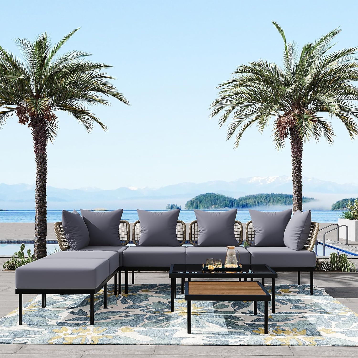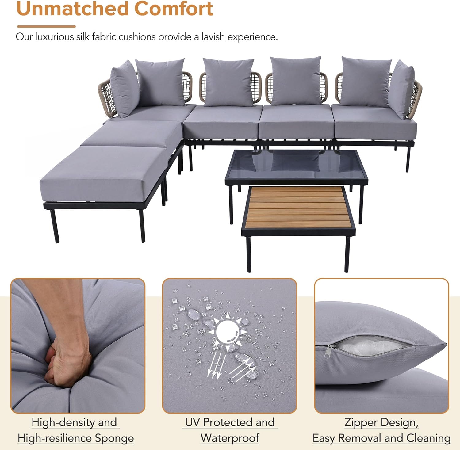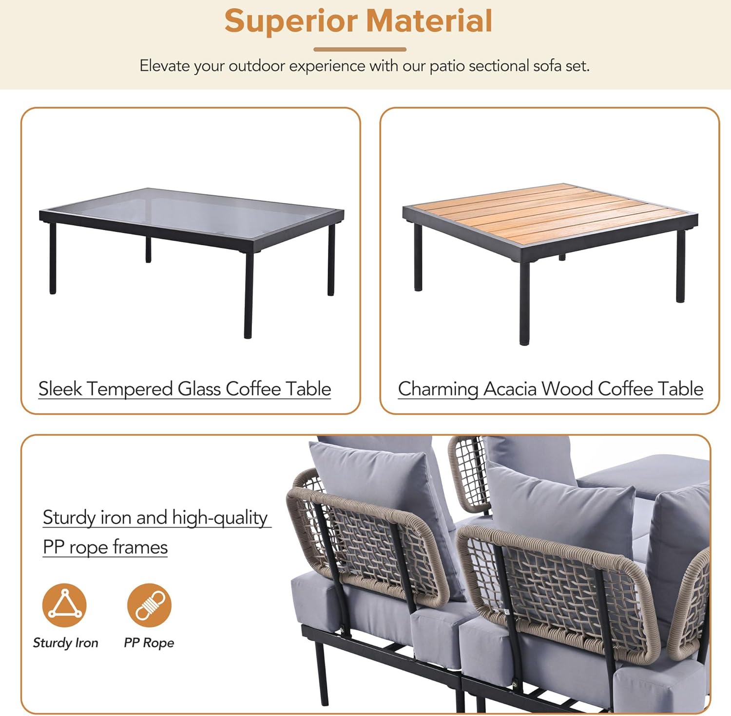 - Superior Material: Elevate your outdoor experience with our patio sectional sofa set, where every detail is designed for both style and functionality. The sleek tempered glass coffee table and charming acacia wood coffee table perfectly complement the modern design of the set, while offering a convenient surface for drinks, snacks, and decor. The set is made from a mix of sturdy iron and high-quality PP rope frames, this set ensures durability and elegance in any outdoor setting.