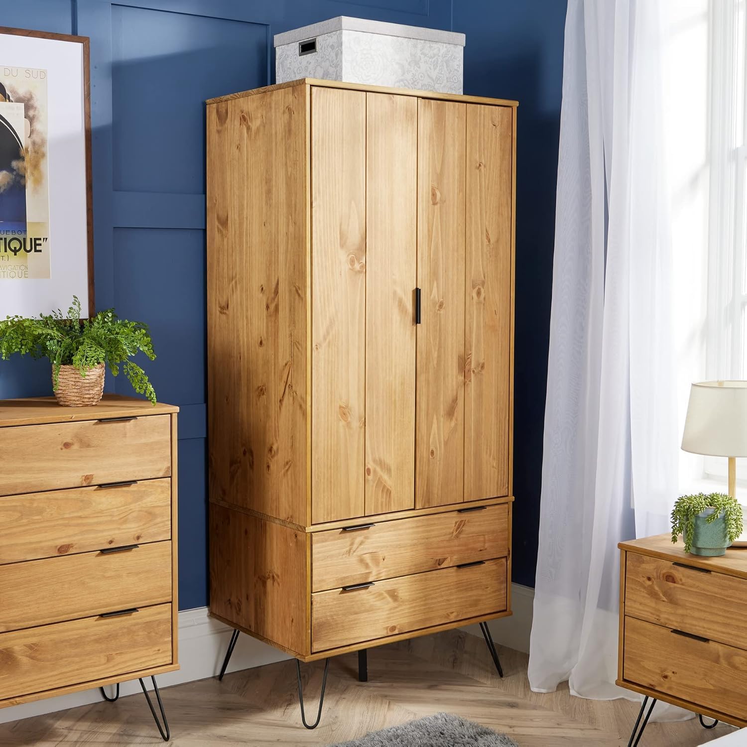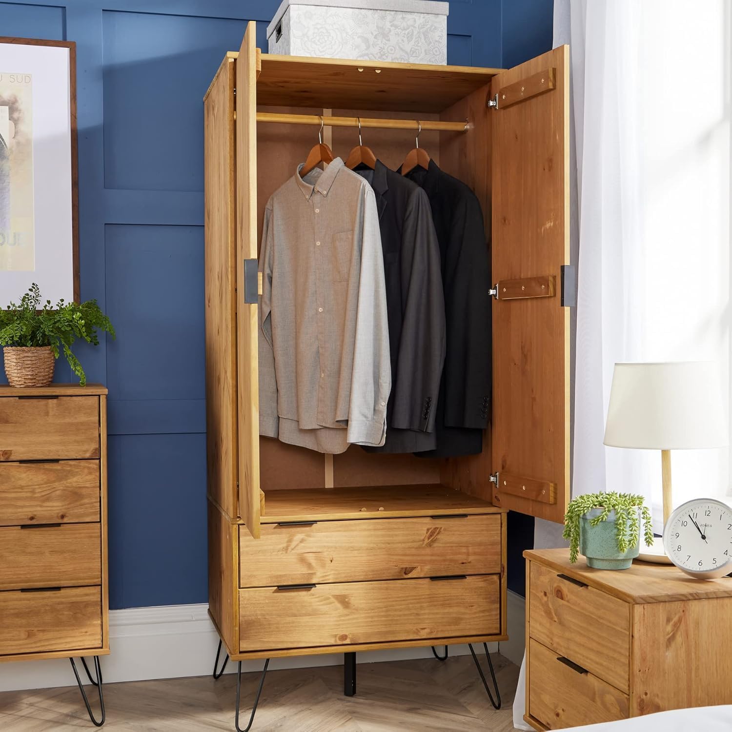 FurniFlex Industrial Solid Wood Hanging Rail Wardrobe with 2 Door and 2 Drawer