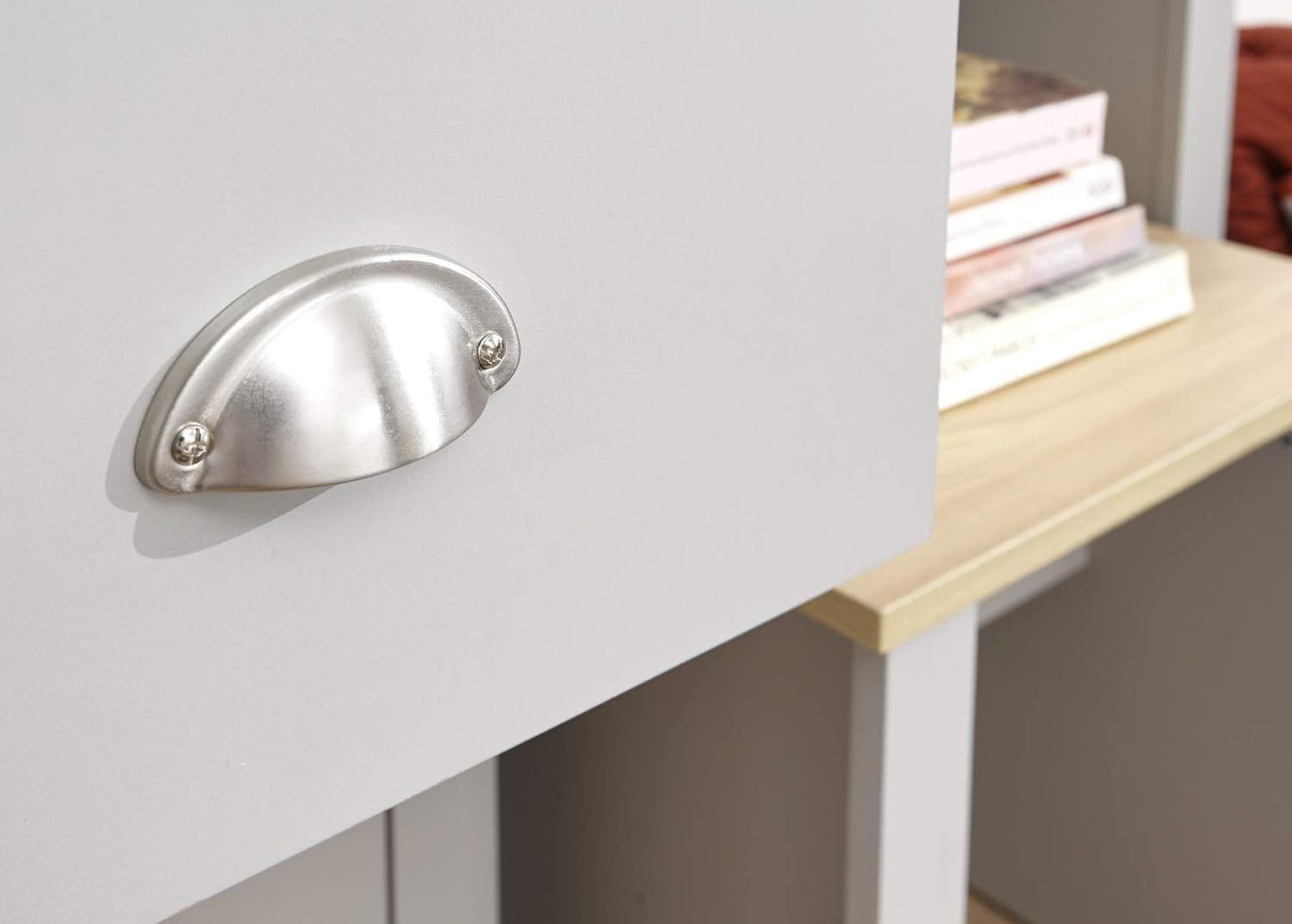 - Comes in modern soft grey finish with contrasting oak veneer top