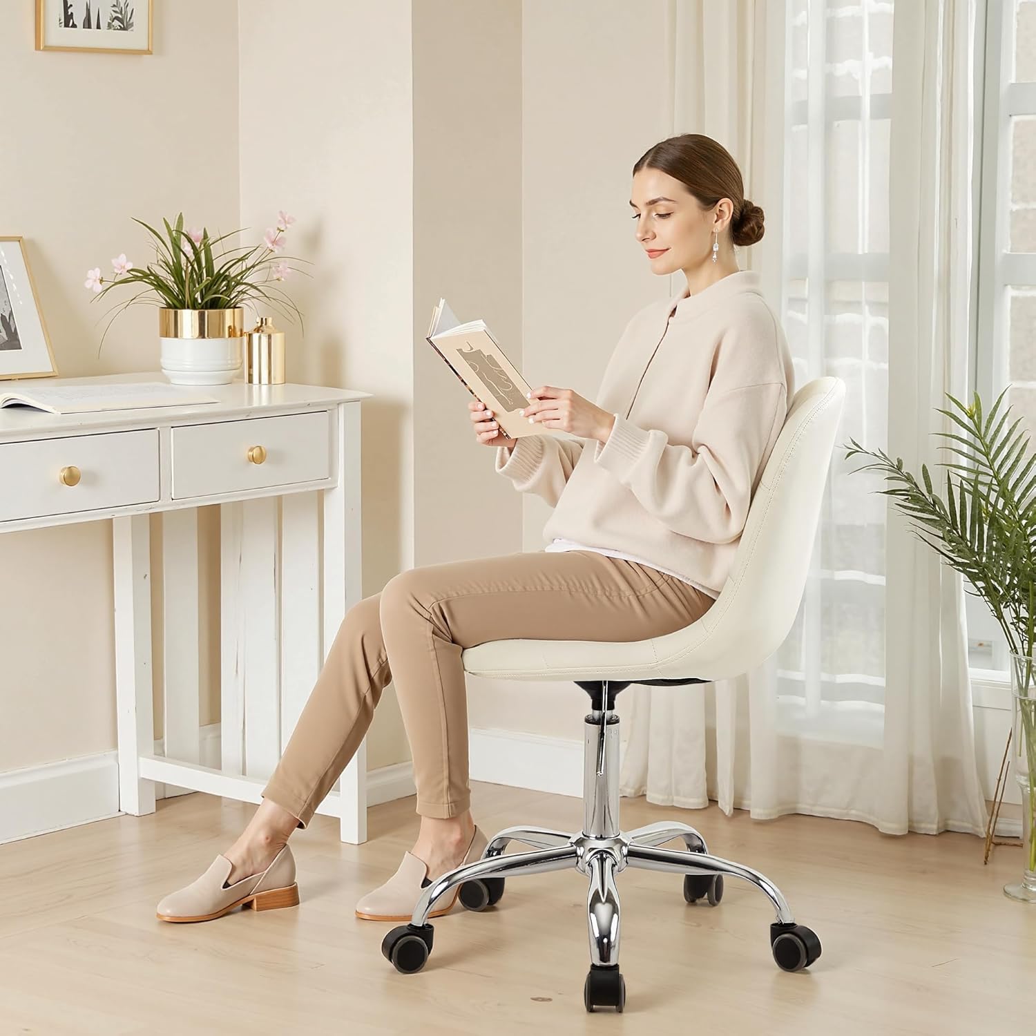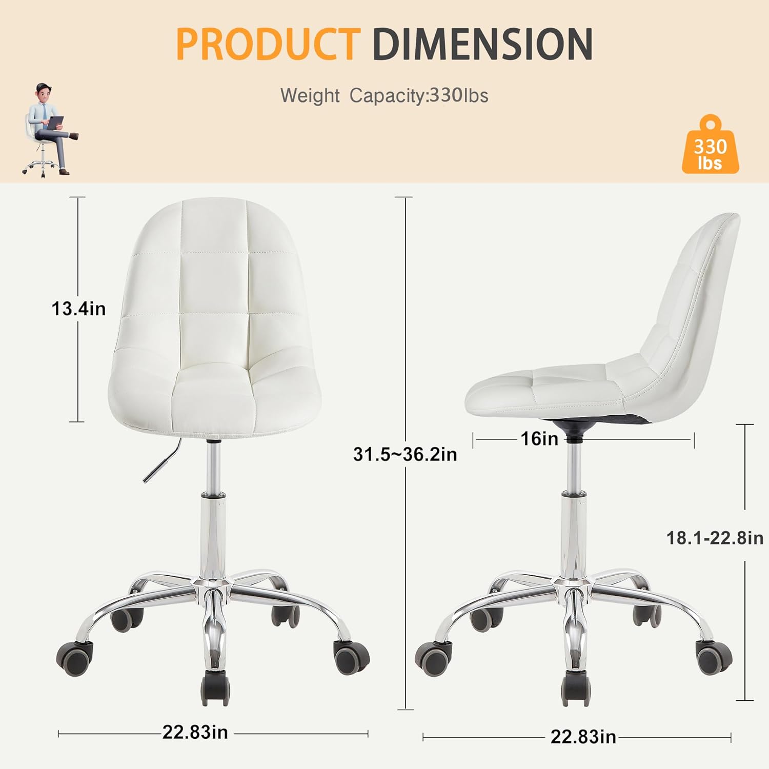 VECELO Armless Home Office Desk Chair, Height Adjustable, PU Leather 360 Degree Swivel with Wheels, Stylish Casual Vanity Seat for Study, Work, Makeup, Leisure, Weight up to 330 Lbs, White