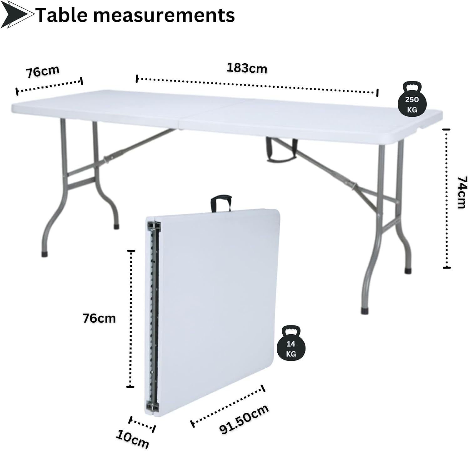 - Table Specifications: 183*76*74cm, Net Weight: 14 kg, Load Capacity:200 kg, Fold in half to save space and facilitate easy transport