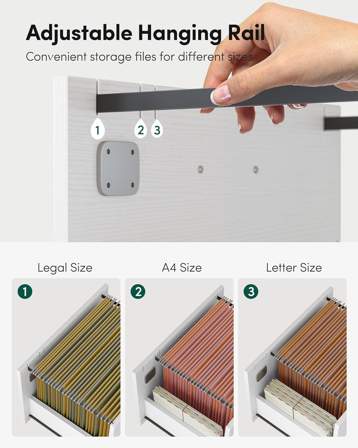• Locking File Cabinet with 3 Drawers: Fezibo file cabinets for home office has 3 drawers. The 2 top drawers provide sufficient storage space for your small items. Bottom drawer with lock keeps hanging legal/letter/A4 size files organized and safe and extends fully for easy access.