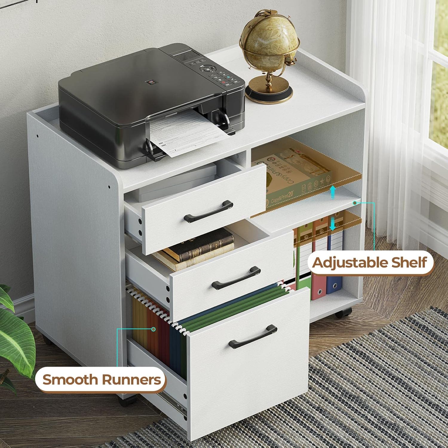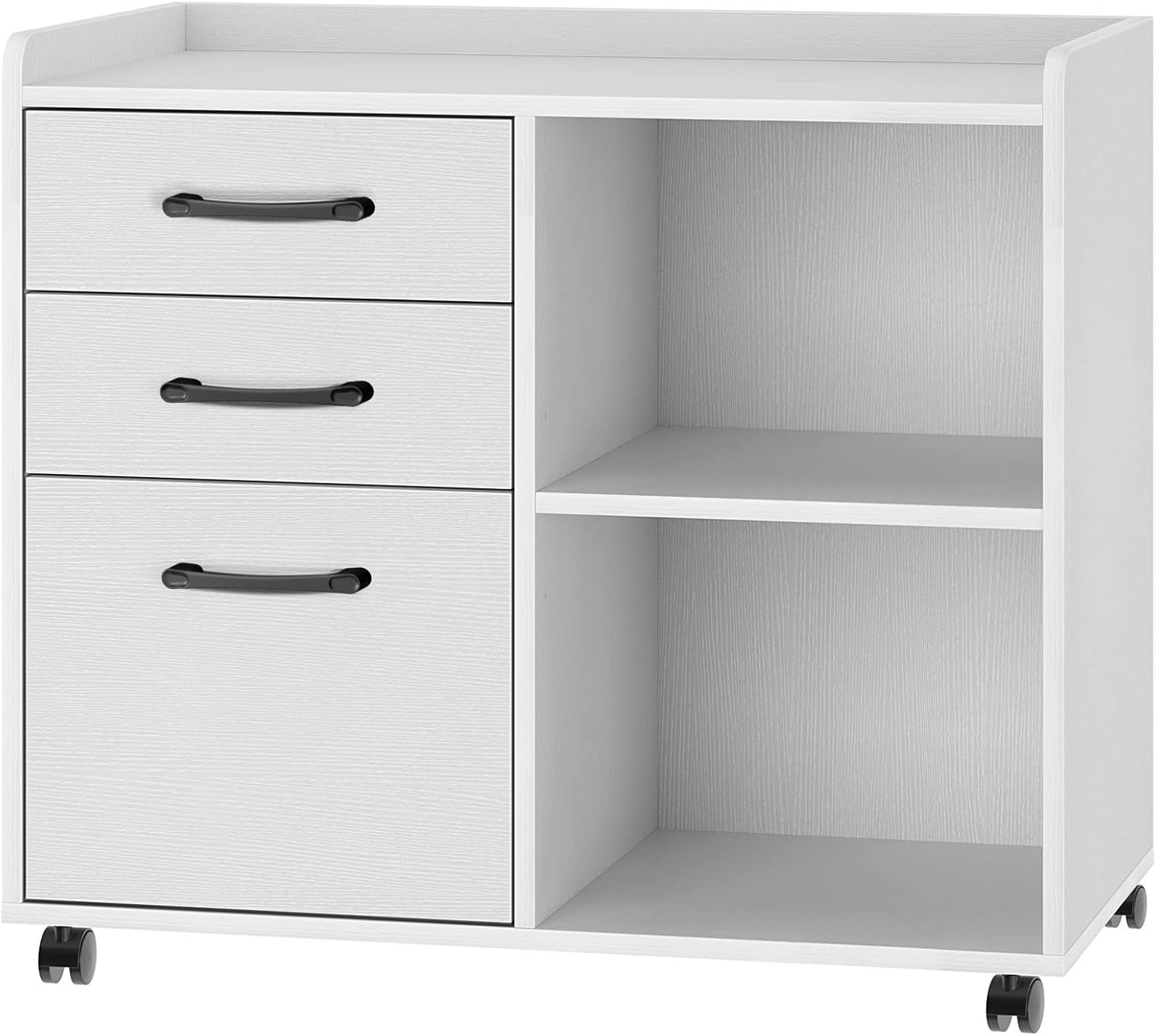 Rolanstar File Cabinet 3-Drawers, Mobile Lateral Printer Stand with Open Storage Shelf, Rolling Filing Cabinet with Wheels for A4/Letter Size,White