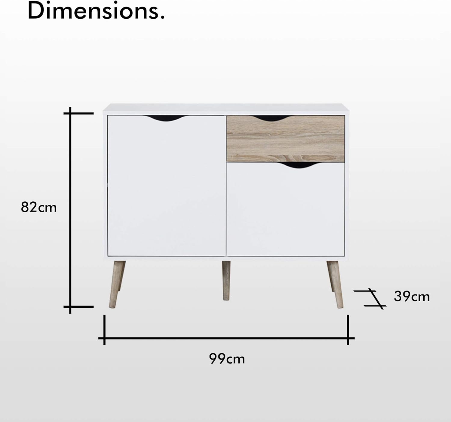 VonHaus Sideboard White & Oak Effect - Small Compact Sideboard Cabinet with 3 Storage Drawers & Cupboards – Nordic Scandi Style Furniture with Tapered Legs - Living Room, Lounge, Home Office & Hallway