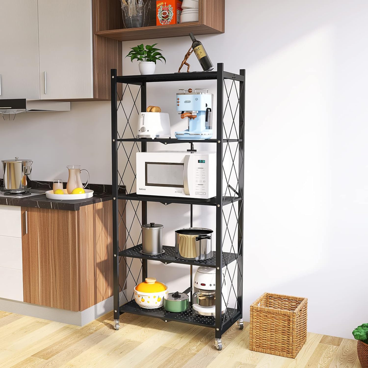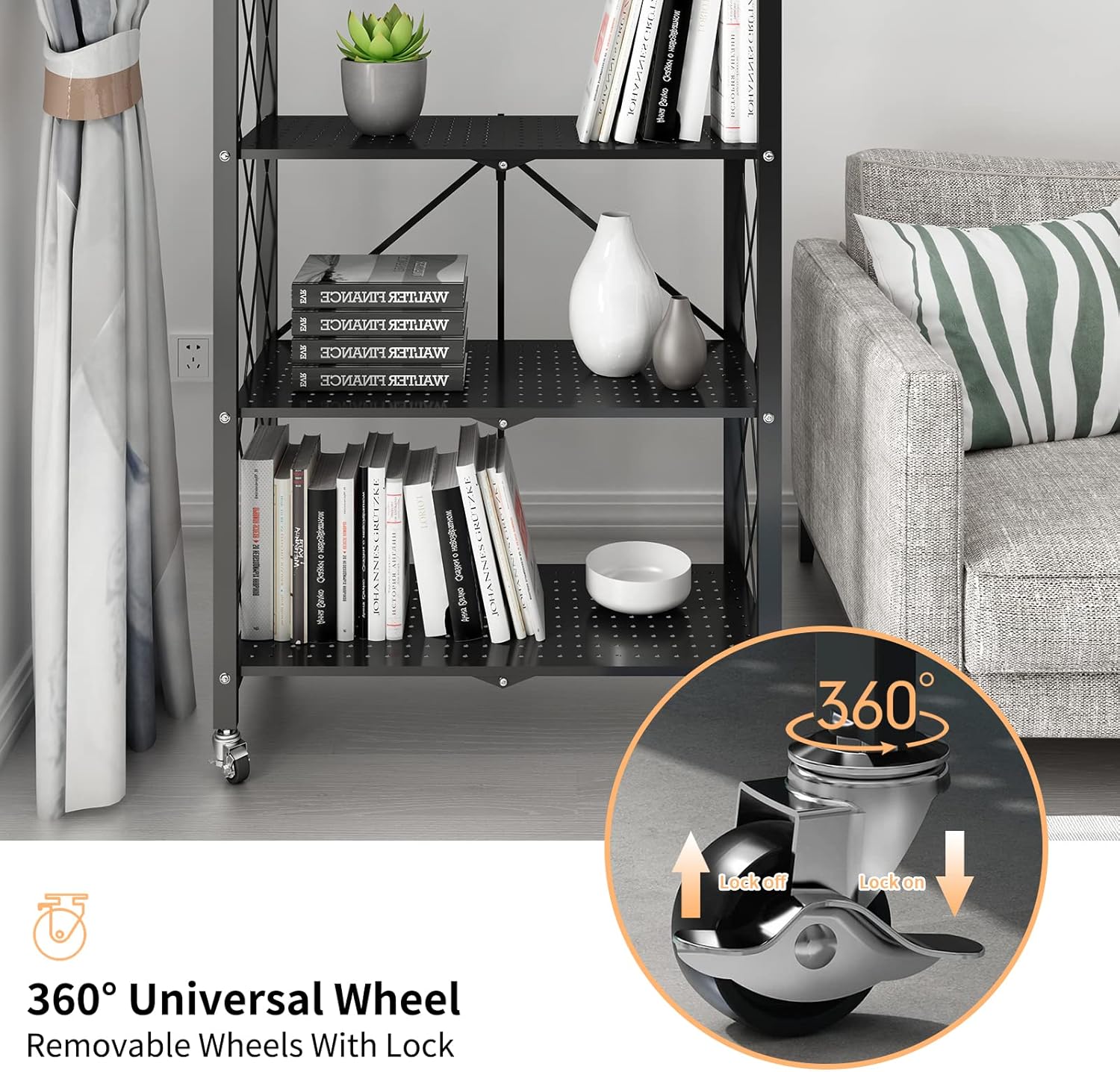 WHIFEA 5 Tier Foldable No Assembly Storage Shelves with Wheels 28.3’’15’’63.2’’ Free Standing Metal Wire Rack Heavy Duty Pantry Collapsible Organizer for Kitchen Bedroom Bathroom Office Black